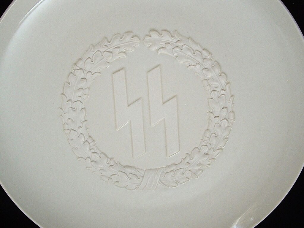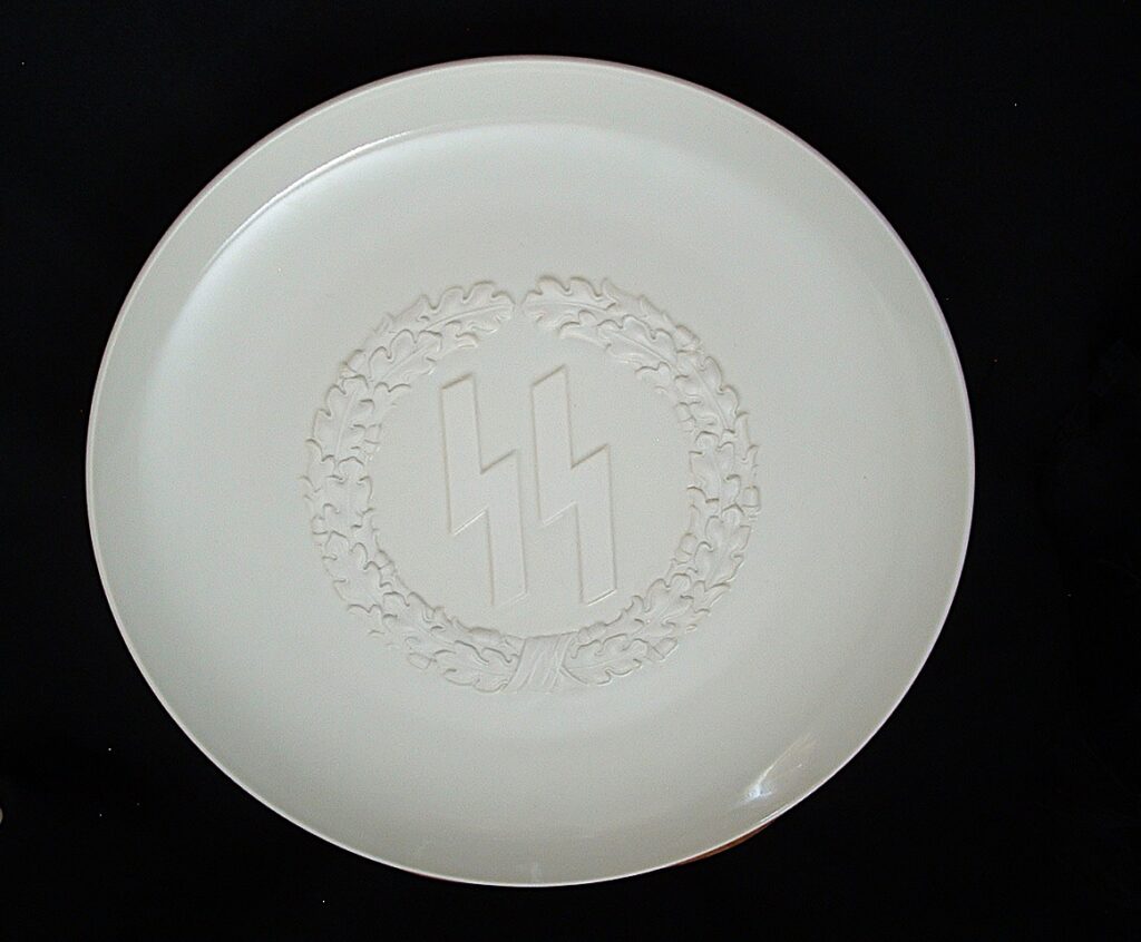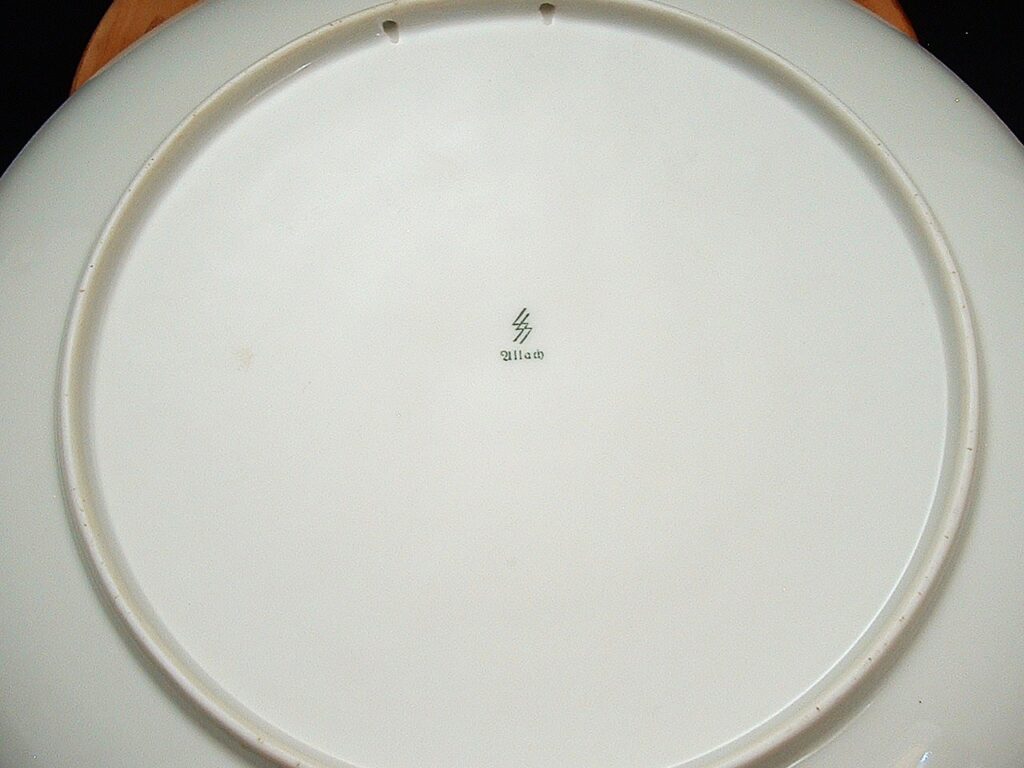 This 10″ diameter Allach plate is absolutely stunning, displaying SS runes surrounded by a wreath of oak leaves, all in relief. The reverse has 2 mold holes, as the plate could be displayed on the wall by its owner if chosen. The center of the reverse is shown the porcelain factory trademark SS runes and Allach name. SOLD
